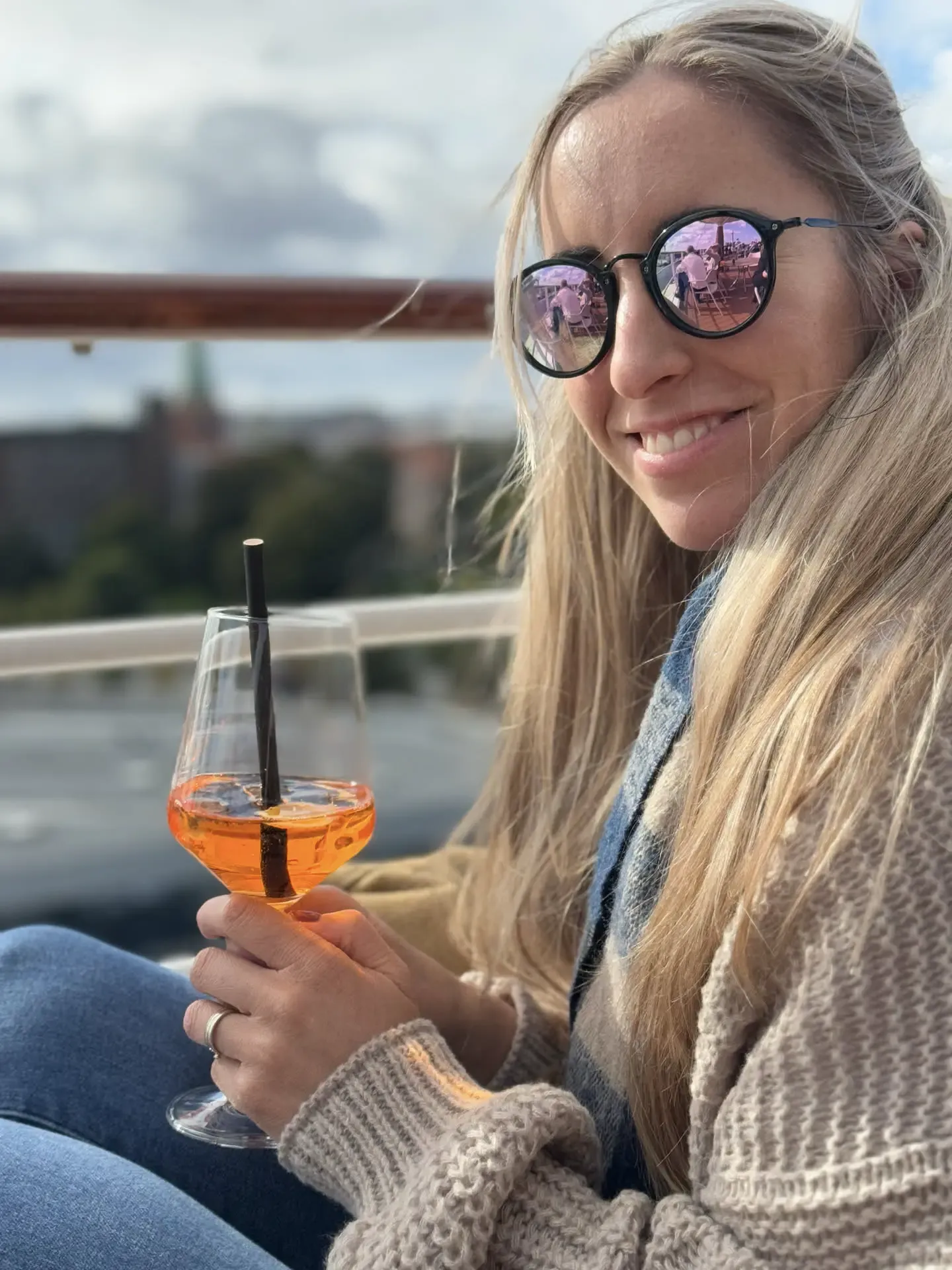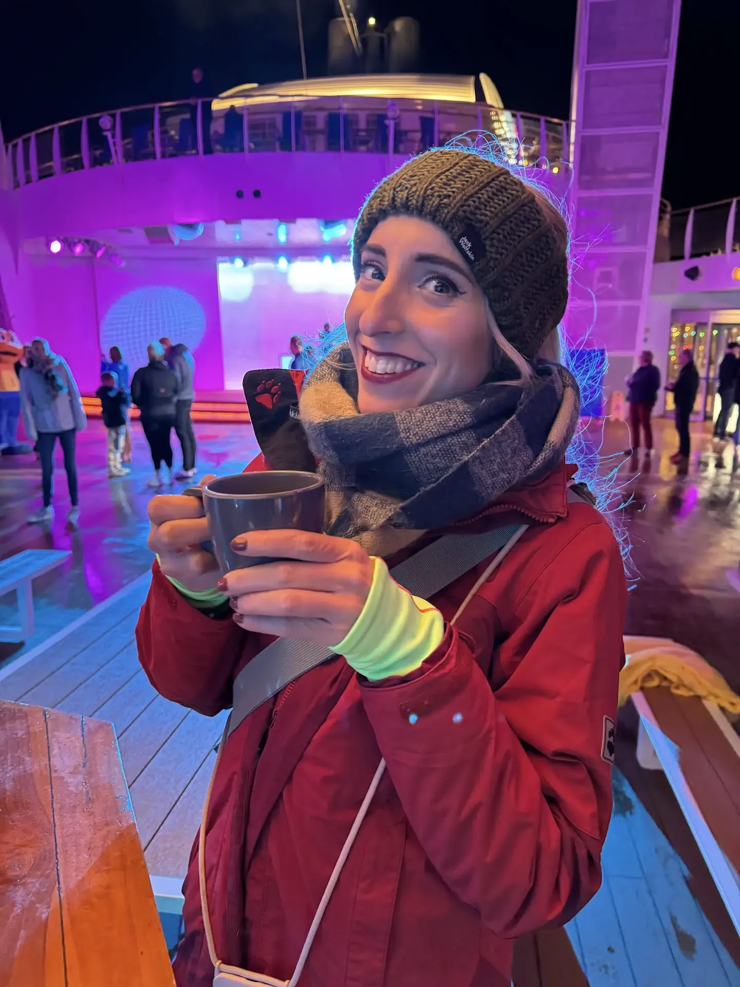Zum Abschluss haben wir noch eine kleine Runde über das Pooldeck gedreht. Dabei wollten wir eigentlich ganz gemütlich einen Glühwein trinken… tja, eigentlich . Der Wind war mal wieder so stark, dass die Hälfte von Biancas Glühwein direkt auf ihrer Jacke gelandet ist 😅