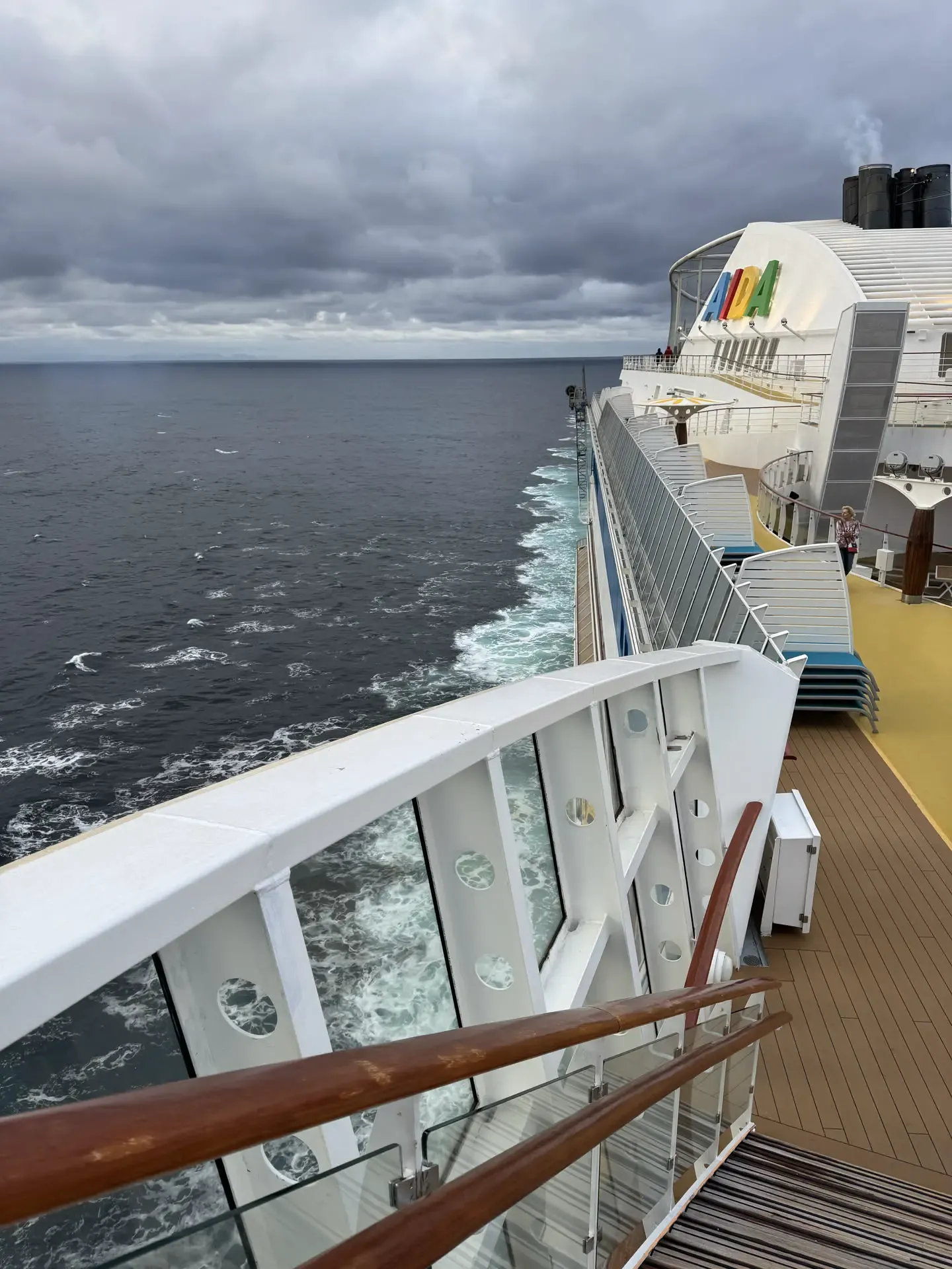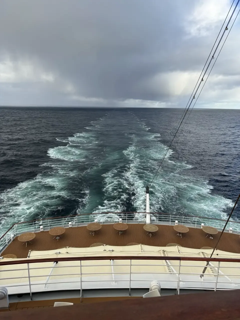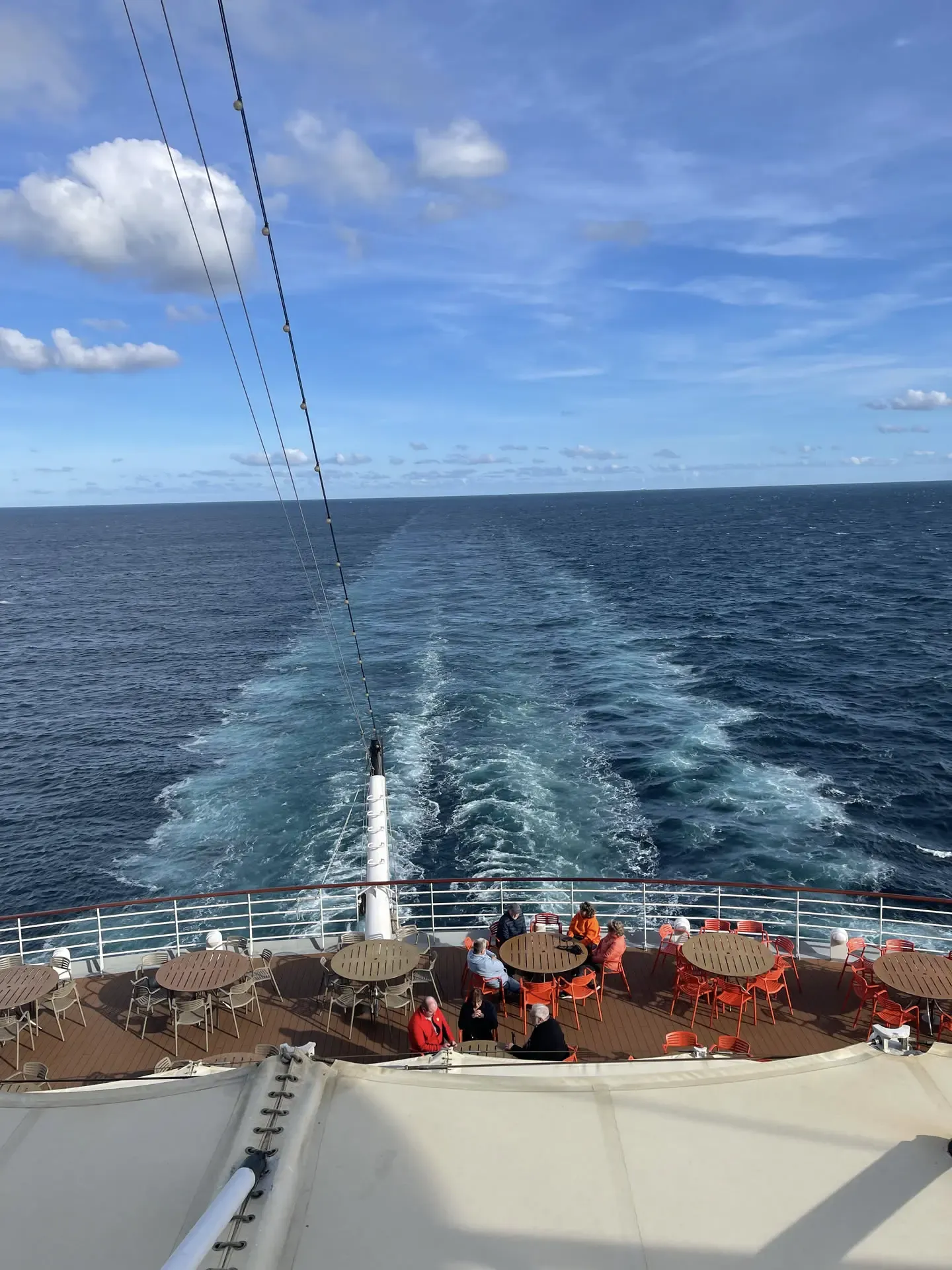Wieder draußen haben wir uns warm eingepackt und sind zur Lanai Bar zurückgekehrt. Für uns einer der schönsten Orte auf dem Schiff. Was gibt es Schöneres, als mit einem Getränk die Heckwelle zu beobachten, ein bisschen zu lesen oder einfach nur die Seele baumeln zu lassen?
