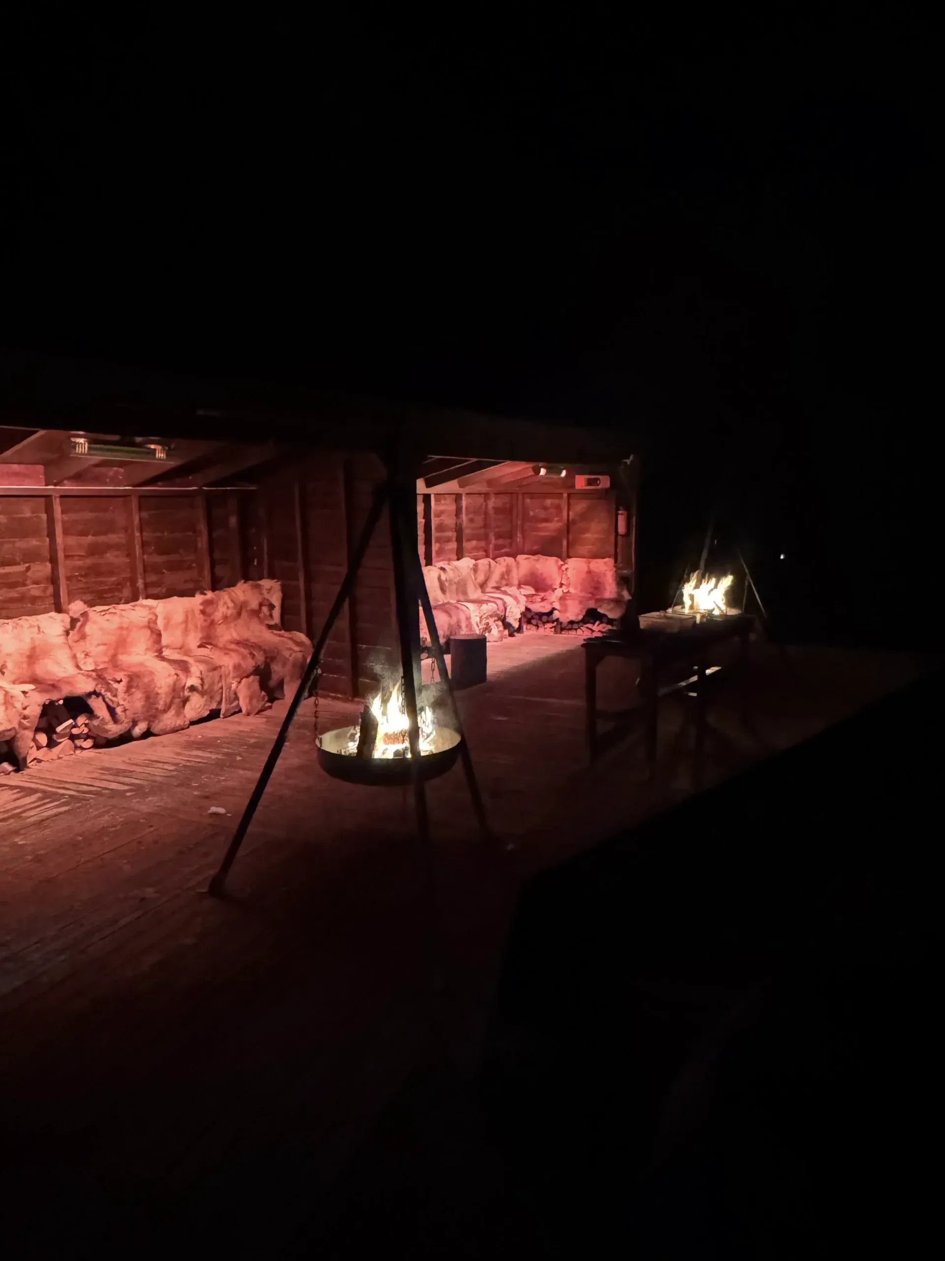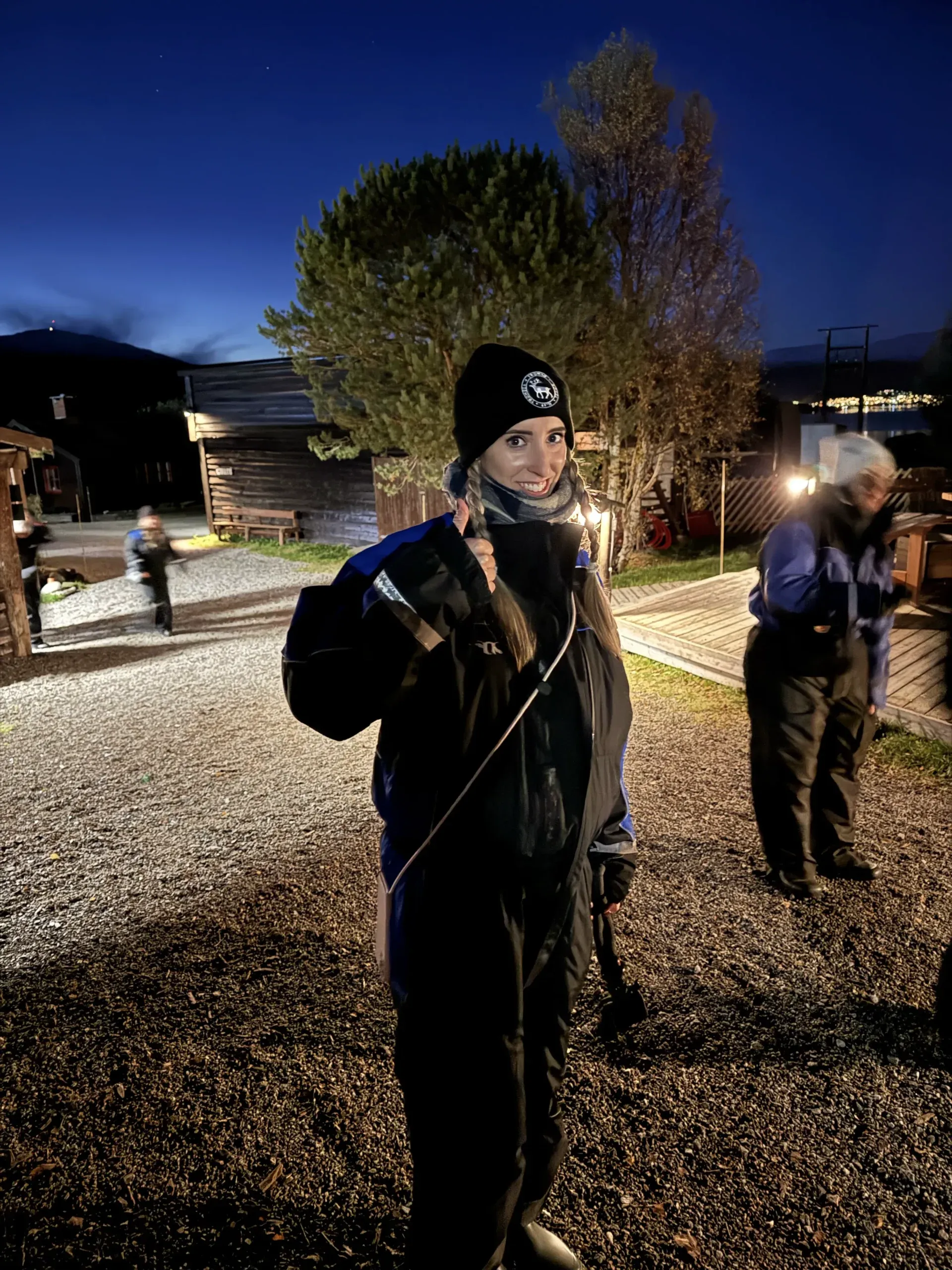 Während wir weiter die Hunde streichelten, staunten und fotografierten, wurde es langsam gemütlicher. Wir versammelten uns um ein kleines Lagerfeuer , rösteten Marshmallows , und bekamen eine warme norwegische Mahlzeit serviert: Baccalà – ein Gericht aus Stockfisch, serviert im traditionellen Lavvo-Zelt der Sami. Die Kombination aus knisterndem Feuer, leckerem Essen und Nordlichtern über unseren Köpfen war einfach unvergesslich .