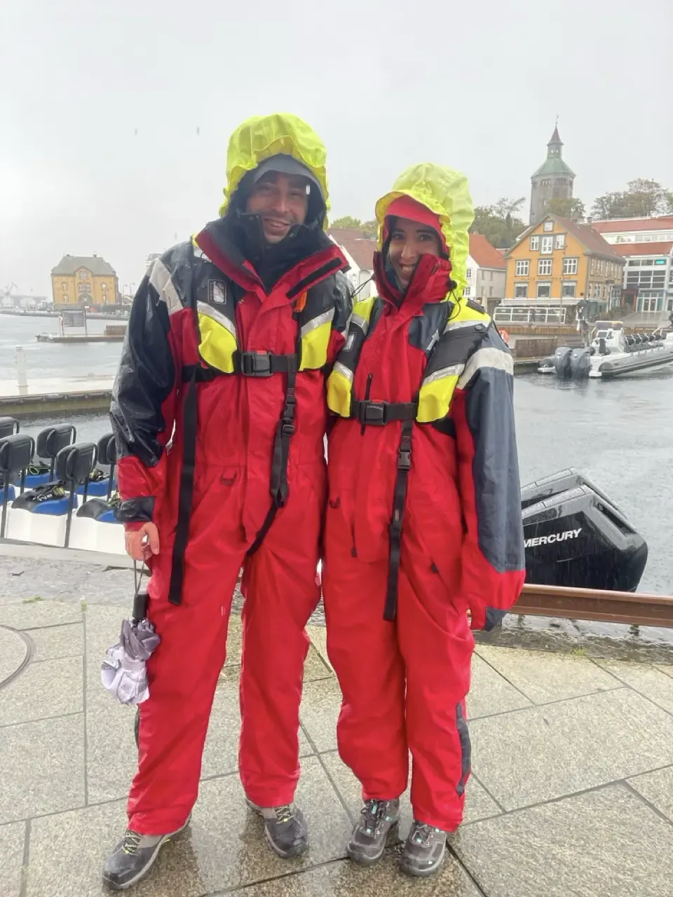 Unser Treffpunkt war ebenfalls ganz in der Nähe des Schiffs. Nach einer kurzen Sicherheitseinweisung wurden wir in rote Overalls , Schutzbrillen und Schwimmwesten eingepackt – und dann ging’s auch schon los!