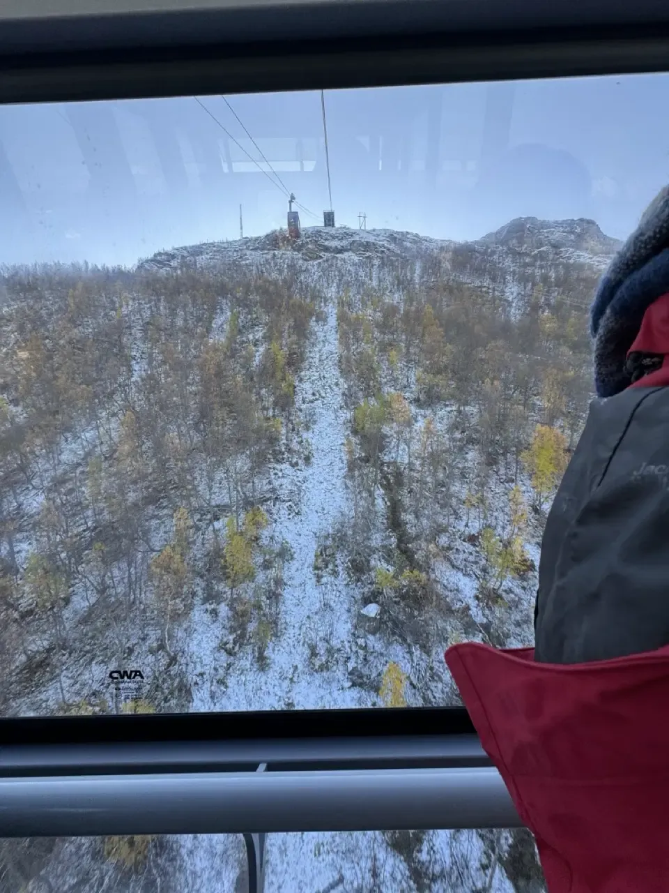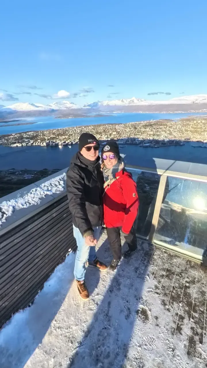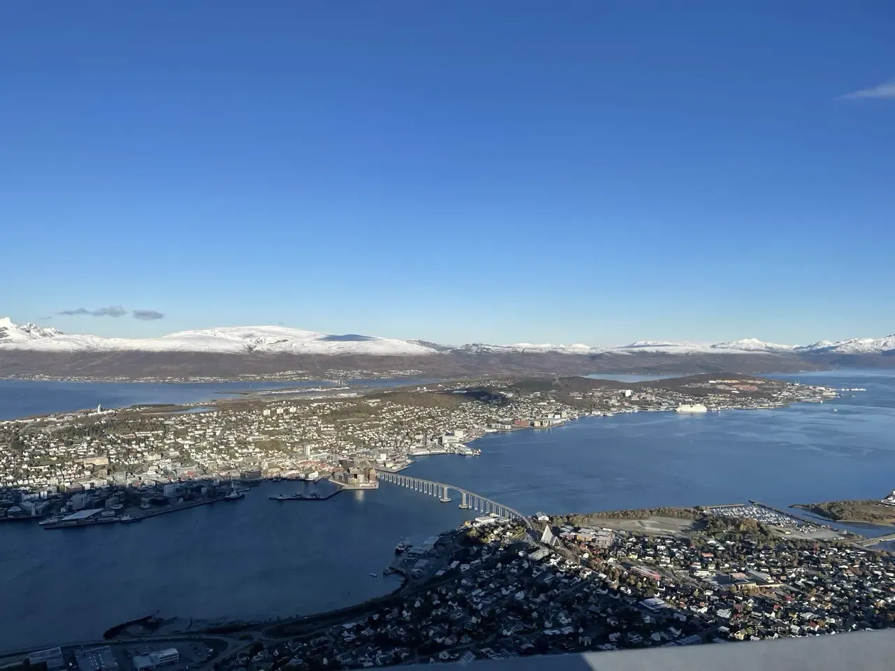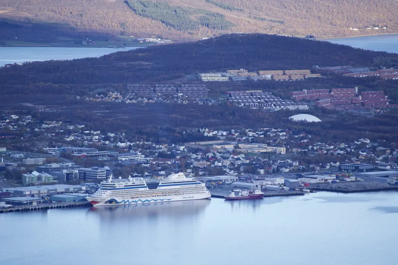 Oben angekommen, wurden wir sofort mit einem fantastischen Rundumblick über Tromsø belohnt. Die Sonne kämpfte sich durch die Wolken, unter uns glitzerte das Wasser – und die AIDAbella konnten wir ebenfalls in der Ferne entdecken ⚓