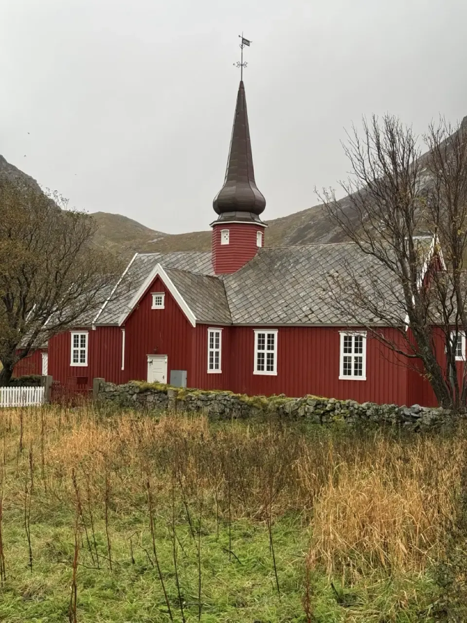 Unser erster Halt führte uns zur Flakstad Kirke , einer kleinen Holzkirche aus dem Jahr 1780 . Sie ist eine der ältesten auf den Lofoten und beeindruckt mit ihrem typisch nordischen Stil – rot gestrichen mit weißem Turm. Direkt nebenan befinden sich übrigens noch alte Gräber und ein kleiner Friedhof mit Meerblick.