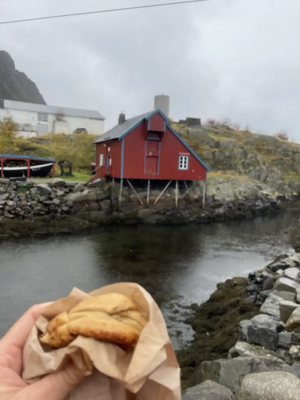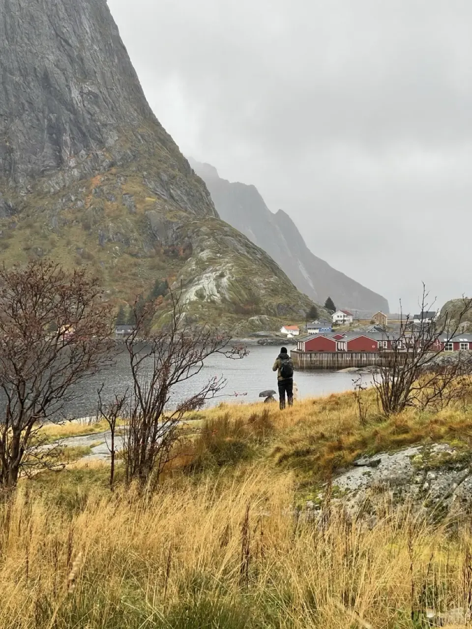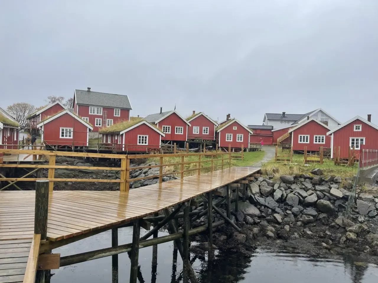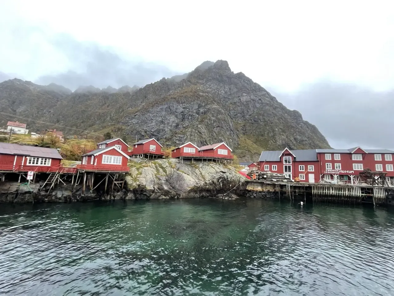 Nächster Halt: Reine . Viele sagen, es sei das schönste Fischerdorf Norwegens – und wir können das gut nachvollziehen. Die roten „ Rorbuer “ (Fischerhütten), die sich um das kristallklare Wasser reihen, sind einfach nur idyllisch. Es gibt hier einen kleinen Souvenirladen und ein Café mit Blick auf die Bucht. Fun Fact: Auf Instagram ist Reine ein absoluter Hotspot – und das völlig zu Recht.